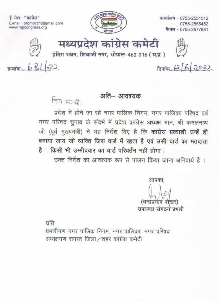 कांग्रेस पार्टी की ओर से रविवार को जारी हुए एक संगठनात्मक आदेश ने कई नेताओं के अरमानों पर पानी फेर दिया है। उपाध्यक्ष संगठन प्रभारी चंद्रप्रभाष शेखर के नाम से जारी इस पत्र ने साफ कहा गया है कि जो दावेदार जिस वार्ड का निवासी है, उसे वहीं से टिकट दिया जाएगा। ऐसे में सेफ सीट से चुनाव लडऩे की तैयारी कर रहे कई नेताओं को झटका लगा है।