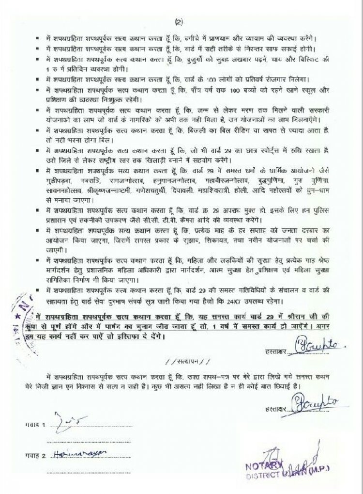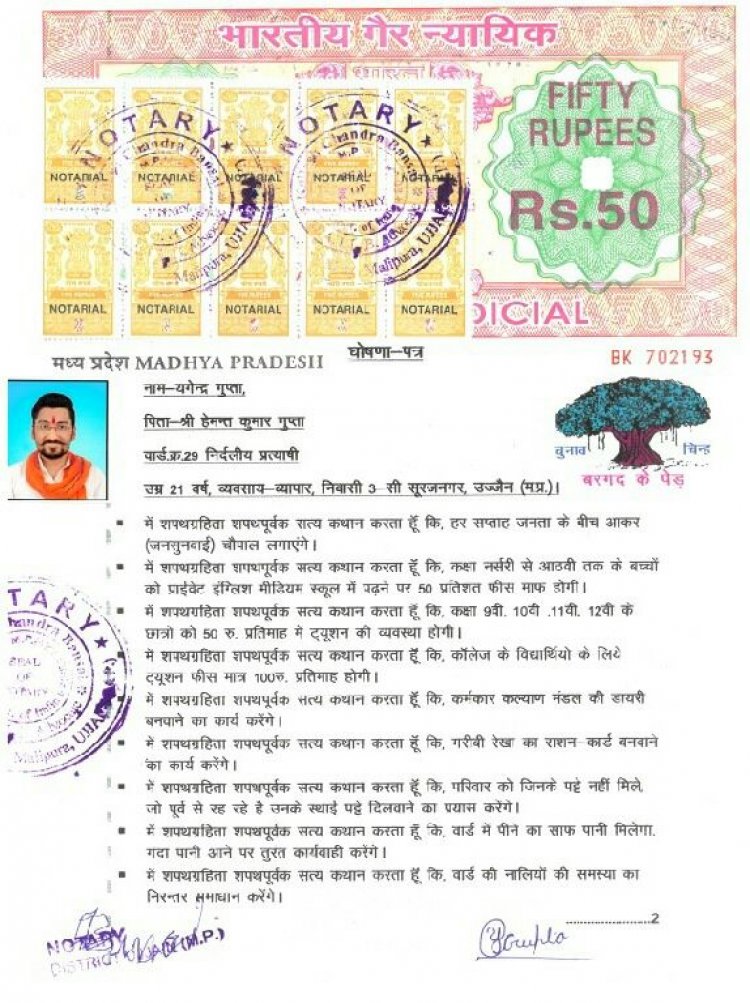 नगरीय निकाय चुनाव में रोजाना नए-नए और रोचक मामले सामने आ रहे हैं। प्रत्याशी मतदाताओं को लुभाने में कोई कसर बाकी नहीं रखा है। ऐसे ही उज्जैन के एक निर्दलीय प्रत्याशी ने अनोखा घोषणा पत्र जारी किया है। 50 रुपए के स्टॉम्प पर नोटरी के माध्यम से प्रत्याशी ने घोषणा की है कि अगर एक साल में ये कार्य नहीं होते हैं तो सारे पदों से इस्तीफा दे दूूंगा।